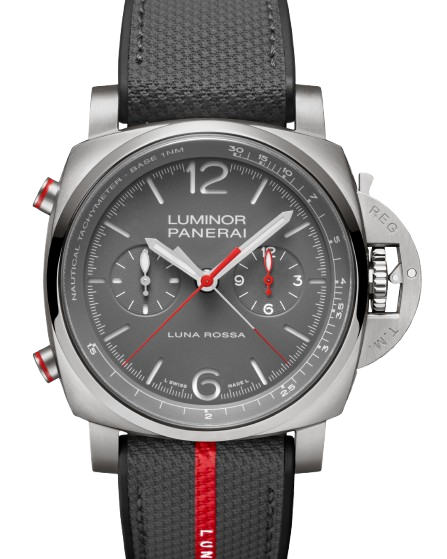 Panerai’s latest offering, the Luminor Chrono Flyback Luna Rossa PAM01654, arrives in a 44 mm Grade 5 titanium case—robust yet feather-light, perfectly suiting its nautical inspiration The brushed finish contrasts elegantly with a polished bezel, accentuated by the signature Luminor crown guard and red-accented flyback pushers.