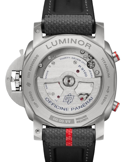 Driving the watch is Panerai’s in-house automatic calibre P.9100: a 302-part movement with a vertical clutch, column wheel, and flyback mechanism for instant chrono reset and restart. Dual barrels grant a three‑day power reserve. At 28,800 vph with a Glucydur balance and Incabloc shock protection, this chrono blends reliability with fine craftsmanship .
