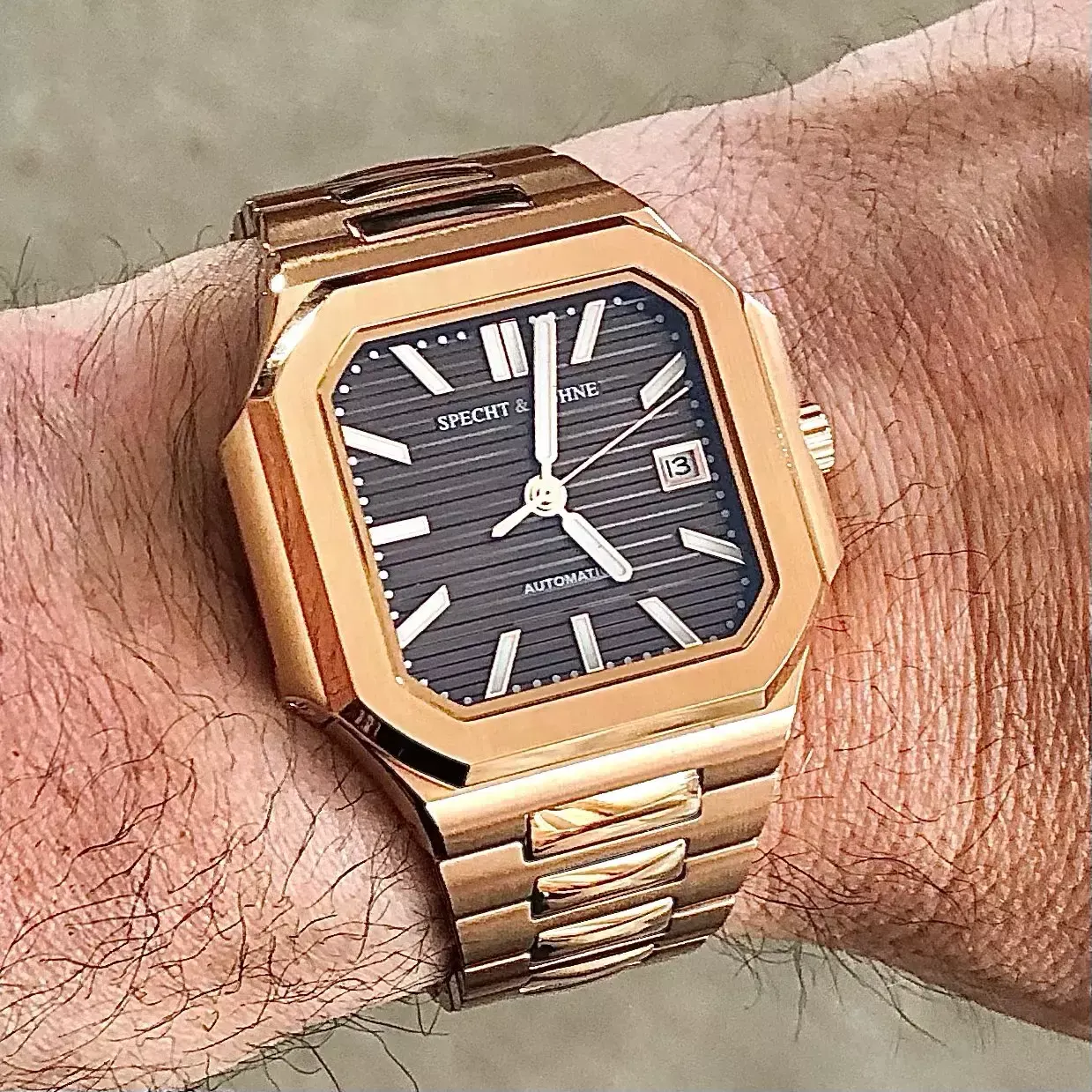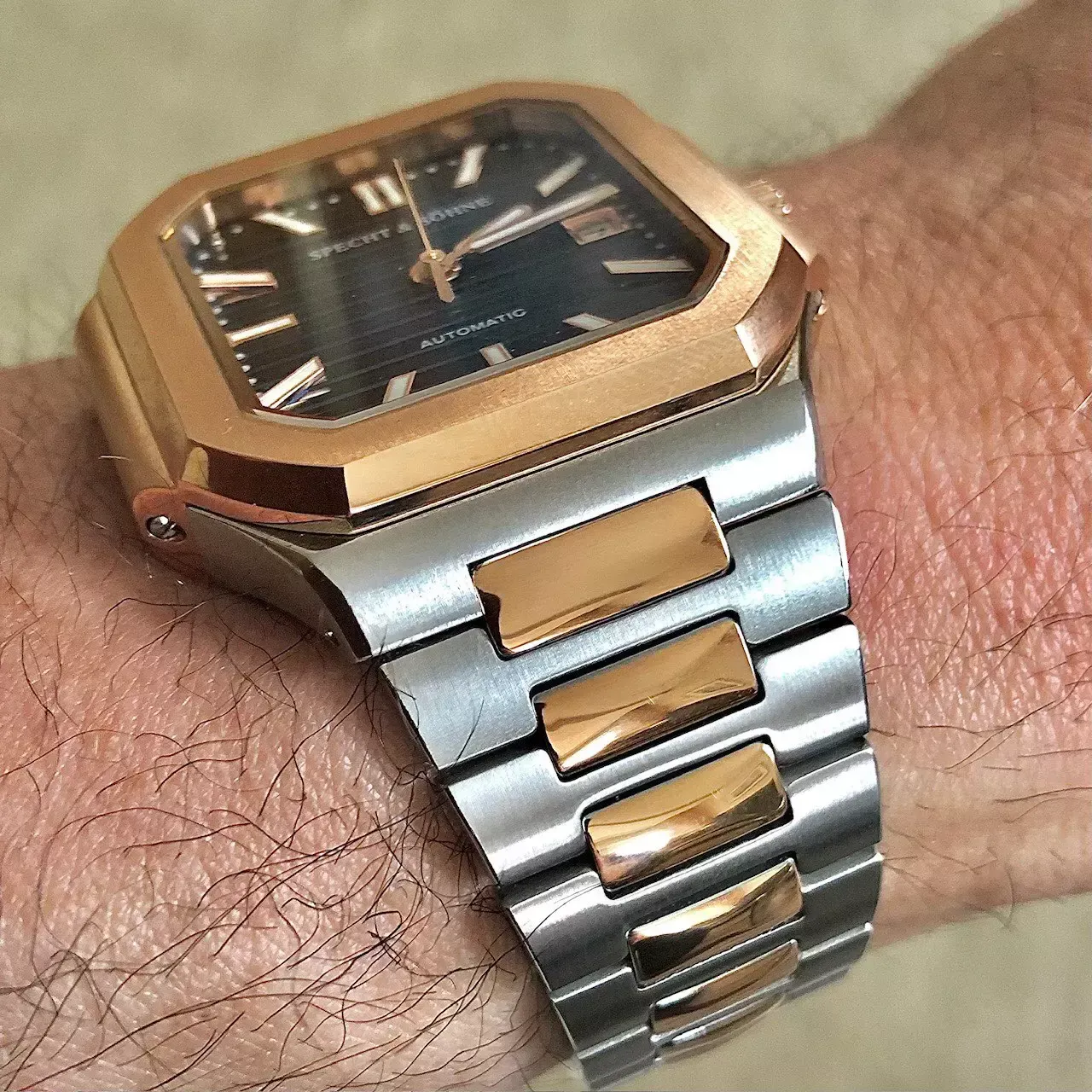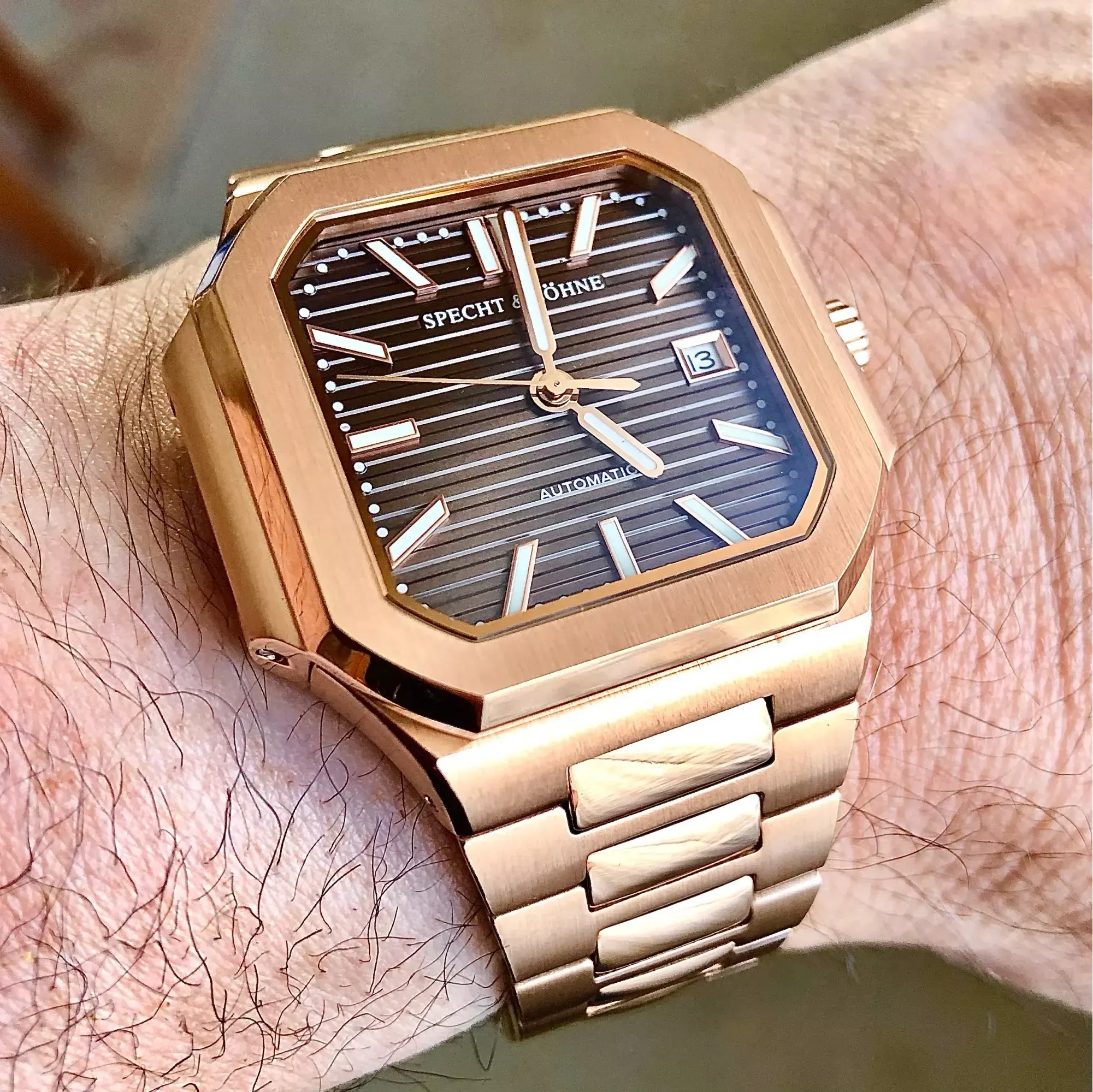 The Specht & Sohne Cubic Automatic is a sophisticated timepiece that pays homage to the iconic design of the Patek Philippe Cubitus, blending classic elegance with modern craftsmanship. Featuring a sleek, rectangular case and a minimalist dial, the Cubic exudes timeless sophistication. Its refined aesthetics are complemented by precise automatic movement, ensuring reliable timekeeping.