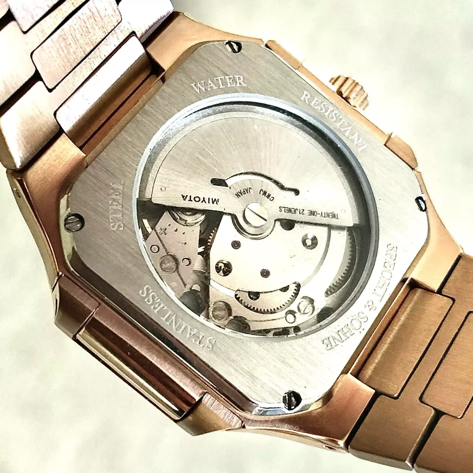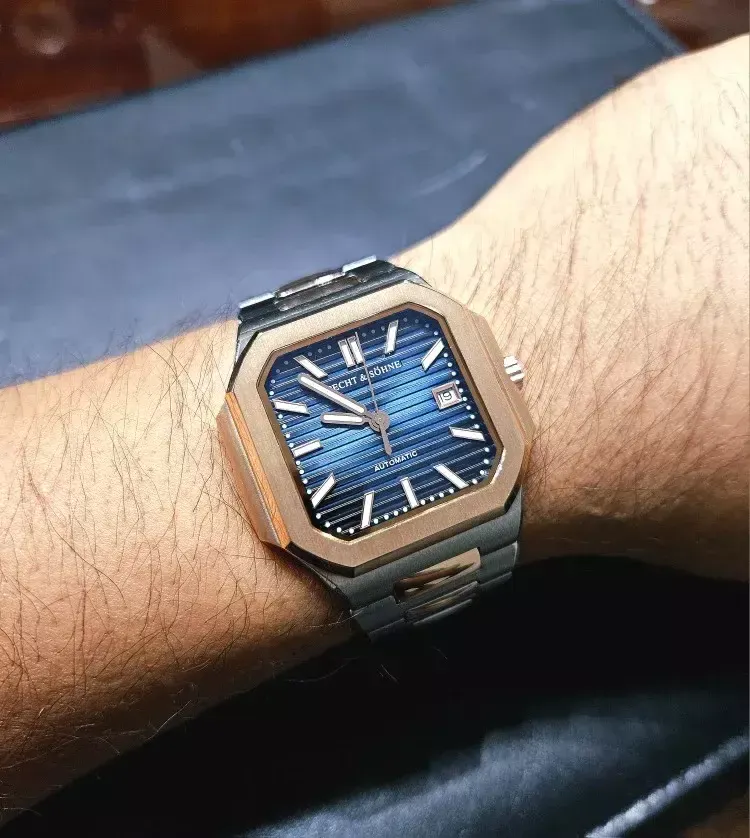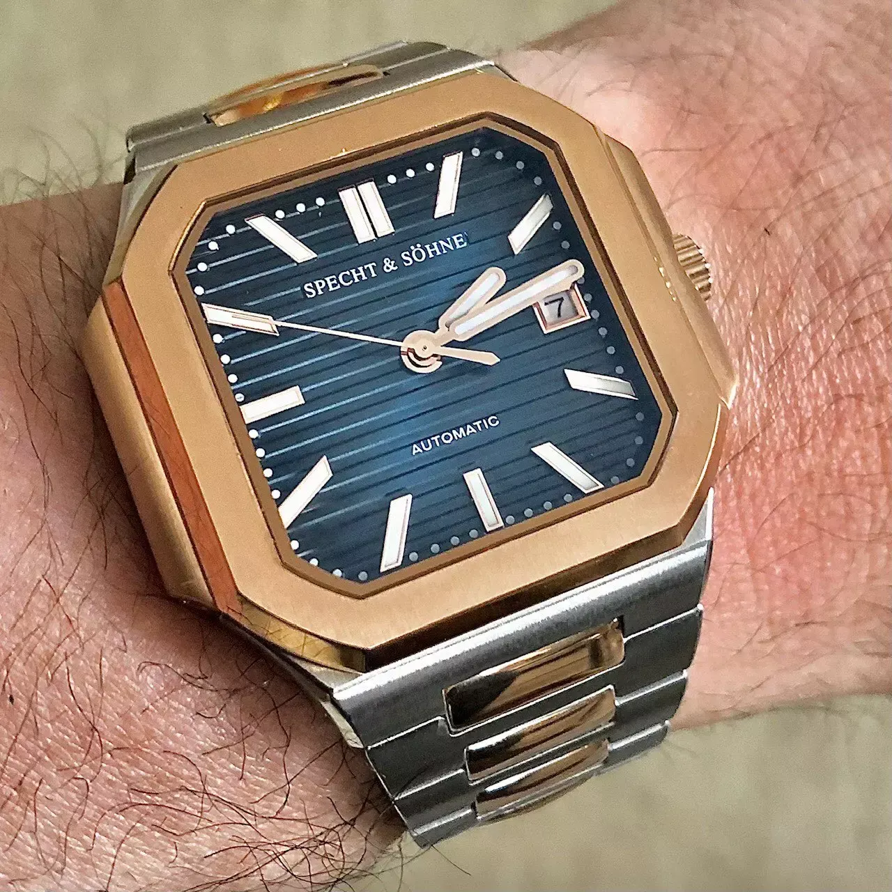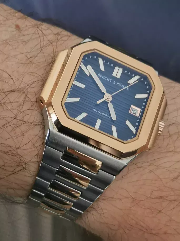 The Specht & Sohne Cubic Automatic is a sophisticated timepiece that pays homage to the iconic design of the Patek Philippe Cubitus, blending classic elegance with modern craftsmanship. Featuring a sleek, rectangular case and a minimalist dial, the Cubic exudes timeless sophistication. Its refined aesthetics are complemented by precise automatic movement, ensuring reliable timekeeping.