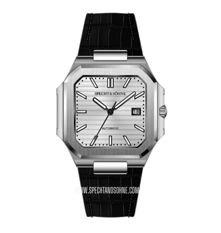 The Specht & Sohne Cubic-L Automatic is a sophisticated timepiece that pays homage to the iconic design of the Patek Philippe Cubitus, blending classic elegance with modern craftsmanship. Featuring a sleek, rectangular case and a minimalist dial, the Cubic exudes timeless sophistication. Its refined aesthetics are complemented by precise automatic movement, ensuring reliable timekeeping.