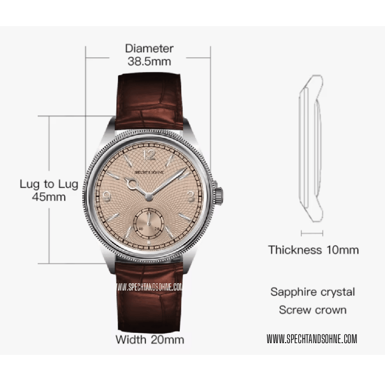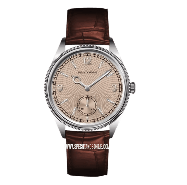 The Specht & Söhne Meridian embodies timeless elegance with a modern mechanical heart. Inspired by the refined proportions and classical aesthetics of early 20th-century dress watches, the Meridian pays subtle homage to the design principles made iconic by the Rolex 1908—clean lines, balanced symmetry, and pure watchmaking simplicity—while standing confidently as a creation of its own.
