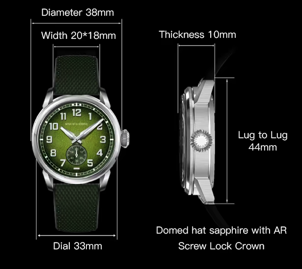 Built for those who appreciate functional elegance, the Pilot features a 38mm stainless steel case with a domed hat sapphire crystal and anti-reflective (AR) coating, ensuring clarity in all lighting conditions. Its screw-lock crown enhances water resistance and durability, embodying the rugged reliability of true pilot instruments.