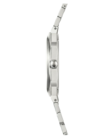 At just 7.5mm thick and 38mm wide, the Scimitar slips effortlessly beneath a cuff while still commanding attention on the wrist. The 316L stainless steel case flows seamlessly into an integrated bracelet — the signature detail of this design language — finished with a secure butterfly clasp for a clean, uninterrupted silhouette. A Japanese ultra-thin quartz movement powers it with reliable, no-fuss precision, while sapphire crystal and a screw-down crown add everyday durability.