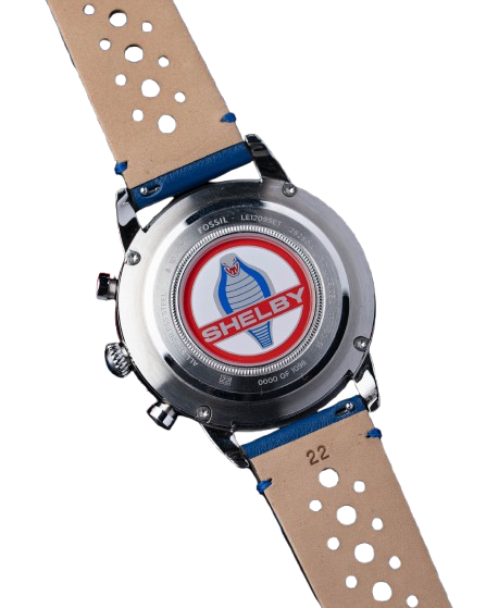 The vibrant Guardsman Blue dial with white racing stripes isn’t just cosmetic—it mirrors Shelby’s Le Mans livery. Subdials, a subtle Cobra logo, and red accents combine passion with polish. While the dial’s busy mix of white markers and lume-filled numerals may impact legibility slightly, the design stays true to its racing roots.